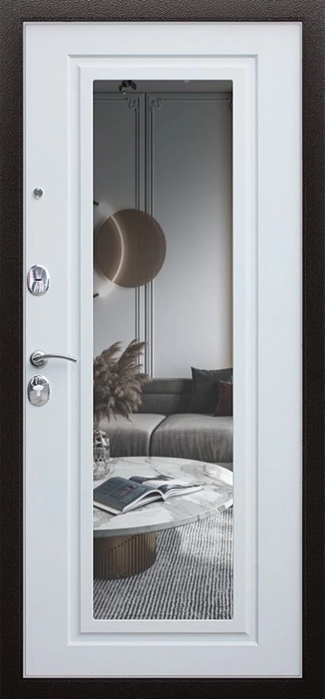 Надежная входная Дверь Комфорт с зеркалом премиум класса по цене 30 603 руб. Большая толщина стали защитит от проникновения в ваш дом, квартиру или коттедж. Используется очень качественная фурнитура: замки, цилиндры, ручки, защелки. Покрытие и отделка двери изготовлено под внимательным контролем производителя. Дверь имеет долгий срок службы и гарантию.